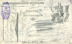 Karte im Querformat. Auf der Vorderseite: "Correspondance militaire / troupes / en campagne ", Adressvordruck, Abbildung: 6 Länderfahnen mit einem Wappen, auf dem "1914" steht, Skizzen und Notizen in französischer Sprache. Auf der Rückseite: Skizzen und Notizen in französischer Sprache.