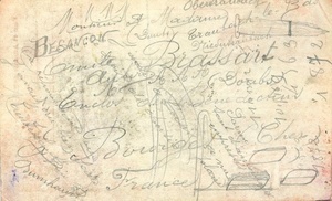 Karte im Querformat. Auf der Vorderseite: "Correspondance militaire / troupes / en campagne ", Adressvordruck, Abbildung: 6 Länderfahnen mit einem Wappen, auf dem "1914" steht, Skizzen und Notizen in französischer Sprache. Auf der Rückseite: Skizzen und Notizen in französischer Sprache.