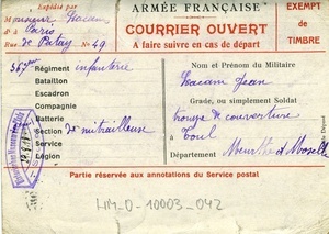 Karte im Querformat. Auf der Vorderseite: "Armée francaise / Courrier ouvert / A faire suivre en cas de départ / Exempt de timbre", unten: "Partie réservée aux annotations du Service postal", Absender: "Monsieur Lacam / à Paris / Rue de Patay 49", Adressat: "Lacam Jean / troupe de couverture / à Toul / Meurthe et Moselle / 567e Régiment infanterie / 2e section de mitrailleuse [Maschinengewehr]". Auf der Rückseite: Stempel: "(...) Jeanne d’Arc / 17 45 / 28 - 8 / 14" und ein handschriftlicher Text. Transkription: "Paris le 26 Août 1914 Mon cher enfant Je ne sais si tu as recu ma lettre mais je voudrais bien avoir de tes nouvelles car nous n’en avons pas recu depuis le 14 Août et le temps nous dûre bien nous n’avons pas de nouvelles de Philippe non plus, fais-nous réponse le plus vite possible et dis-nous comment tu te porte Je t’embrasse de tout coeur Tes parents G. Lacam 49 rue de Patay, Paris 13e". Übersetzung: "Paris, den 26. August 1914 Mein liebes Kind Ich weiß nicht, ob du meinen Brief erhalten hast, aber ich hätte gerne Neues von dir gehört, denn wir haben seit dem 14. August nichts mehr erfahren und die Zeit kommt uns sehr lang vor, wir haben auch von Philippe nichts Neues erfahren, gib uns Antwort so schnell als möglich und sag uns wie es dir geht Ich umarme dich von ganzem Herzen Deine Eltern G. Lacam Rue de Patay Nr. 49, Paris 13. Arrondissement".