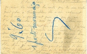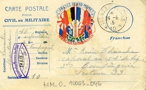 Karte im Querformat. Auf der Vorderseite: "Carte postale / pour / Civil ou Militaire", Abbildung: 6 Landesfahnen, über denen in einem Banner geschrieben steht "France quand-même!" [Trotzdem Frankreich], in der Mitte von diesen steht "RF" [Französische Republik] und darunter "Gloire aux armées alliés!" [Ehre den alliierten Armeen], Absender: "Lenaitre / Martial / 46e Régiment d’Infanterie / 2 Bataillon / 5e Compagnie / 2 Section / Secteur postal 10", Adressat: "Monsieur Renée (Chérache) / caporal [Hauptgefreiter] au 54e de ligne / 3e Compagnie / Secteur 33", Stempel: "Tresor et Postes / 10 / 24 - 6 / 15". Auf der Rückseite ein handschriftlicher Text: Transkription: "le 22 Juin 1915 Cher copain Je vient de recevoir ta carte que tu m’a écrite quand j’étais à Fontainbleau elle a (...) seulement que 2 mois a venir c’est pour cela que je ne t’ai pas repondu. Je suis au (...) depuis deux mois deja mais Camille n’est pas encore partie. J’éspère qu’à Bouffémont tous le monde va bien ainsi que toi. Moi c’est toujours (pas mal) je me porte toujour bien aussi. J’ai (su que) ton frère Eugene etait bon mais le frangin est (...) lui, il était méchant. Cher René je ne voie plus grand chose a te dire pour le moment. Je fini en te serrant cordialement la main. Ton copain Martial Lenaitre" [über den Text hinweg steht mit blauem Buntstift geschrieben:] "9x 60 1 porte monnaie". Übersetzung: "den 22. Juni 1915 Lieber Freund Ich habe gerade deine Karte erhalten, die du mir geschrieben hast als ich in Fontainbleau war, sie hat nur 2 Monate (gebraucht), um anzukommen, deshalb habe ich dir nicht geantwortet. Ich bin in (…) seit zwei Monaten schon, aber Camille ist noch nicht gegangen. Ich hoffe, dass in Bouffémont alle gesund sind und du auch. Bei mir ist es immernoch nicht schlecht, ich halte mich auch gut. Ich wusste, dass dein Bruder Eugene gesund war, aber der Bruder ist (...), er war böse. Lieber René, ich sehe keine großen Dinge mehr zu berichten im Moment. Ich beende und drücke dir herzlich die Hand. Dein Freund Martial Lenaitre".