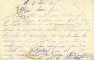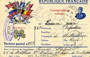 Karte im Querformat. Auf der Vorderseite: "République francaise / Correspondance / militaire", Abbildung: links: Eine Frauenfigur mit Flügeln breitet die Arme aus und hält Zweige in den Händen, hinter ihr erkennt man 6 Landesfahnen, unter ihren Füßen steht geschrieben "pro patria" [für das Vaterland] und "Gloire aux alliés" [Ehre den Alliierten], darunter ein vierblättriges Kleeblat, über welchem steht "Porte-Bonheur" [Glückbringer] und in den Blättern steht "1915" zu lesen, rechts: Portrait eines Soldaten [vermutlich Joseph Joffre], Absender: "Ferrand Alphonse / 26e d’Artillerie 8e Batterie 2e Section de Bombardeur", Adressat: "Lacam Jean / 367 Régiment Infanterie / Compagnie de Mittrailleuse / par Toul / Secteur postal 123", Stempel: "Tresor et Postes / 70 / 5 - 5 / 15". Auf der Rückseite ein handschriftlicher Text. Transkription: "Le 3 Mai 1915 Cher beaux frère je t’(écris) cette carte pour te dire que je suis changer d’adresse comme tu le (verra) de l’autre cotée de la carte maintenant je te dirais de ne pas en parler à (Felicie) ni des fois elle te demandais des explication la desus car il ne faut pas que, Andrée sache que c’est plus dangereux que ou j’etait alors comptant sur toi je te serre cordialement la main ton poteau qui pense à toi Alphonse. Vive le petit salé". Übersetzung: "Den 3. Mai 1915 Lieber Schwager Ich schreibe dir diese Karte um dir zu sagen, dass ich meine Adresse geändert habe, wie du auf der anderen Seite der Karte sehen wirst, jetzt würde ich dir sagen, nicht mit (Felicie) darüber zu sprechen und auch nicht im Falle, dass sie dich nach Erklärungen darüber fragt, denn es muss nicht sein, dass Andrée weiß, dass es gefährlicher ist, wo ich jetzt bin. Ich zähle auf dich und drücke dir herzlich die Hand, dein Kumpel, der an dich denkt Alphonse. Es lebe das Pökelfleisch".