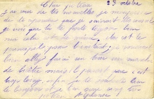 Karte im Querformat Vorderseite: "Carte postale / Pour la Correspondance des Armées de la République / (Franchise Postale)", seitlich: "Trés important / Cette Carte ne sera remise rapi- / dement que si elle ne comporte que des nouvelles personnelles." [Sehr wichtig / Diese Karte wird nur schnell übermittelt werden, wenn sie nur persönliche Neuigkeiten enthält.], Abbildung: 5 Landesfahnen, die mit einem Band zusammengehalten werden, Absender: "Ferrand / 26e d’Artillerie / 63e Batt(...) Chartres / (...) Loire, Adressat: "Jean Lacam / 1e Soldat / 367e d’Infanterie / 2e section Mitrailleuse / Compagnie Hor-rang Toul / Meurthe et Moselle"; Rückseite: handschriftlicher Text Transkription: "23 octobre Cher poteau J’ai recu de tes nouvelles, je m’empresse de te repondre que je suivrait tes conseils je vois que tu te porte toujour bien moi cela est de même, cela est le principale pour l’instant; je voudrait bien aller faire un tour un marcher de bicêtre mais il parait que c’est trop long, enfin je te souhaite bien le bonjour et je t’en serre cinq ton poteau Alphonse" Übersetzung: "23 Oktober Lieber Kumpel Ich habe deine Neuigkeiten erhalten, ich beeile mich, um dir zu antworten, dass ich deine Ratschläge befolge. Ich sehe, dass du ich noch immer gut hälst, bei mir ist es das gleiche, das ist das Wichtigste im Moment, ich würde gern eine Tour machen, einen Ausflug nach Bicêtre, aber es scheint zu lang zu sein, schließlich wünsche ich dir einen guten Tag und ich drücke dir die Fünf, dein Kumpel Alphonse"