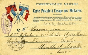 Karte im Querformat Vorderseite: "Correspondance militaire / Carte Postale à l’usage des Militaires / Cette carte doit être remise au vaguemestre. Elle ne doit porter aucune indication du lieu d’envoi ni aucun renseignement sur les opérations militaires passées ou futures. S’il en était autrement, elle ne serait pas transmise." [Diese Karte muss beim Postmeister abgegeben werden. Sie darf keine Angabe zum Absendeort und keine Auskunft über vergangene oder zukünftige Militäroperationen enthalten. Anderenfalls wird sie nicht überbracht.], Abbildung: 4 Länderfahnen, die mit einem Band zusammengehalten werden, Adressat: Lacam Jean / 367e Infanterie 2e Section Mitrailleuse / Compagnie Hor-rang Toul / Meurthe et Moselle / à Suivre", Stempel: Tresor et Postes / 70 / 08 - 12 / 14"; Rückseite: handschriftlicher Text Transkription "4 decembre 1914 Mon vieux poteau, je t’ai envoyer une carte le 22 j’espère qu’elle t’est arriver et que celle ci rencontrera ta reponse j’espère que tu te porte toujour bien quant à moi je ne me porte pas trop mal mais je suis fatigué, car maintenant que je suis au 80 de montagne nous n’avons plus de chevaux pour nous trainer et je n’avais pas beaucoup d’entrainement pour la marche enfin vivement que l’on revoyent la petite famille ainsi que le petit salé je te souhaite toujour une bonne santée et une bonne pognée de main de ton pôte Alphonse" Übersetzung: "4. Dezember 1914 Mein alter Kumpel Ich habe dir am 22. eine Karte geschickt, ich hoffe, sie ist angekommen und sie trifft bald deine Antwort, ich hoffe, dass es dir immernoch gut geht, was mich betrifft, mir geht es nicht allzu schlecht, aber ich bin müde, denn jetzt wo ich im 80. der Berge bin und wir keine Pferde mehr haben, um zu trainieren und ich habe nicht viel Ausdauer für den Marsch schließlich wird die kleine Familie hoffentlich bald zurückgeschickt ebenso wie das Pökelfleisch. Ich wünsche dir noch eine gute Gesundheit und einen guten Händedruck von deinem Kumpel Alphonse"