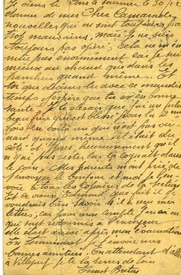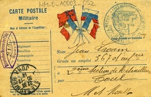 Karte im Querformat Vorderseite: "Carte postale / Militaire", unten: "Pour la destination consulter l’affiche apposée dans les bureaux de Poste et les mairies" [Für die Adresse, konsultieren Sie die Aushänge in den Postämtern und Rathäusern], Abbildung: 4 Länderfahnen, die mit einem Band zusammengehalten werden, Adressat: "Jean Lacam / 367 d’Infanterie / 2e Section de Mitrailleuse / Toul / M et Moselle", Stempel 1: "Lons le saunier Jura / 22 35 / 30 - 12 / 14", Stempel 2: "Hôpital (…) du territoire No 106 - Le medecin chef - Envoi des (…) de France"; Rückseite: handschriftlicher Text Transkription: "le 30 / 12 Cher camerade Je viens te donner de mes nouvelles qui ne sont toujours pas trop mauvaises, mais je ne suis toujours pas opéré, cela ne m’ennuie pas énormément car je suis mieux au chaud que dans les tranchées quand mêmes. Et toi que deviens tu avec ce maudit temps j’espère que tu es en bonne santé. Je te disais que j’ai un futur beau frère qui est blessé pour la 2e fois en voilà un qui n’est pas veinard quand même, il était du côté d’(Ifires), heureusement qu’il n’y ai pas rester car ca cognait dans le coin. Mes parents m’ont prié de t’envoyer le bonjour et moi je l’envoie à tous les copains de la Secteur. Et le vieux (Echnard) que fait il. Je voudrais bien savoir s’il a recu mes lettres, car pour mon confite j’en ai eu qui sont retournés à l’envoyeur. Elle était (...) après mon evacuation. En terminant je t’envoie mes bonnes amitiées. En attendant d’aller a Villejuif je te la serres de loin (...)" Übersetzung: "der 30. 12. Lieber Kamarad Ich schickte dir gerade meine Neuigkeiten, die immernoch nicht zu schlecht sind, aber ich wurde immernoch nicht operiert, aber das ärgert mich nicht sehr, denn ich ich bin besser im Warmen als in Schützengräben. Und du, was machst du mit der verfluchten Zeit, ich hoffe, du bist gesund. Ich sagte dir, dass ich einen Bruder habe, der zum 2. Mal verwundet wurde, er ist wirklich kein Glückspilz, er war auf der Seite von (Ifires), glücklicherweise ist er nicht geblieben, denn es pochte in der Ecke. Meine Eltern haben mich gebeten, dir Grüße zu sagen und ich schicke sie an alle Freunde im Sektor. Und was macht der alte (Echnard). Ich wüsste gern, ob er meine Briefe bekommen hat, denn bei meinem Eingemachten hatte ich welche, die zum Absender zurückkamen. (...) nach meiner Evakuierung. Schließend sende ich dir herzliche Grüße. In der Erwartung, nach Villejuif zu gehen, drücke ich dir die Hand von weitem (...)"