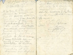 Karte im Querformat mit angehängter Antwortkarte Vorderseite 1. Karte: "République francaise / Carte nationale Aller aux Armées", Abbildung: 3 Landesfahnen links oben, 4 Fahnen mittig oben, in rot geschrieben steht "Toutes pour une - une pour toutes" [Alle für einen - einer für alle], Absender: "L.Veray) 409e Régiment 9e Compagnie secteur 98", mit violettem Farbstift wurde die "31" aus der Anschrift durch eine "29" ersetzt, Adressat: "Rat Octave / 120 Re de Lignes / 31e Compagnie / (Louvie Inf Gueenis)", Stempel: "Tresor et Postes 98"; Vorderseite 2. Karte: "Carte nationale Retour des Armées / Note Officielle: / Cette carte sera transmise / immédiatement à son adresse / à condition expresse de ne don- / ner que des nouvelles person- / nelles ou d’autres militaires / de même corps. / Ministère de la Guerre." [Diese Karte wird sofort an die Anschrift geliefert werden unter der ausdrücklichen Bedingung, nur persönliche Neuigkeiten oder die anderer Soldaten des gleichen Korps zu geben / Das Kriegsministerium]; Rückseite Karte 1+2: handschriftlicher Text Transkription: "Le 6 juin 1915 Mon vieux copain J’ai recu ta lettre du 26 (…) en même temps que tu dois en avoir recus une de moi. J’ai rien de nouveau de t’apprendre et je te souhaite que tu (…) encore longtemps au dépot nous sommes dans un secteur assez tranquille, esperons nous bientôt la fin de guerre. Nous retrouver tous ensemble j’ai eu des nouvelles d’Arthur Laron, que tu dois connaitre, il est toujours sur la front au bonne santé, mais son beau frêre a été (...). Plus rien a te dire pour aujourd’hui, bonne santé, courage et (...) je te serre cordialement la main. Ton vieux copain Veray" Übersetzung: "6. Juni 1915 Mein alter Freund Ich habe deinen Brief vom 26. (…) erhalten, zur gleichen Zeit wie du einen von mir bekommen haben musst. Ich habe nichts neues zu berichten und ich wünsche dir, dass du noch lange Zeit im Depot (bleibst). Wir sind in einem sehr ruhigen Sektor, erhoffen wir das baldige Ende des Krieges. Wir finden uns alle wieder, ich habe Neuigkeiten von Arthur Laron erfahren, die du kennen musst, er ist noch an der Front und gesund, aber sein lieber Bruder wurde (...). Für heute gibt es nichts mehr zu sagen, viel Gesundheit, Mut und (...) ich drücke dir herzlich die Hand. Dein alter Freund Veray"