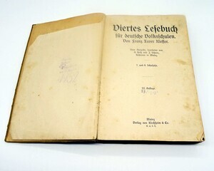 Exakter Titel: Viertes Lesebuch für deutsche Volksschulen von Franz Xaver Kieffer. Neue Ausgabe, bearbeitet von A. Heiß und J. Schorn, Rektoren in Mainz. 7. und 8. Schuljahr. 33 Auflage