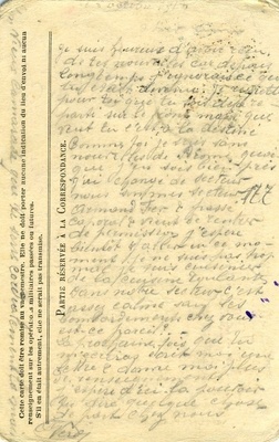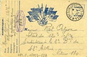 Karte im Querformat Vorderseite: "Correspondance / des Armées de la République / Carte en Franchise", Abbildung: 7 Länderfahnen, die mit einem Band zusammengehalten werden, Künstlersignatur: "Stern", Absender: "L. Verdy / 409e Régiment / 9e Compagnie / Secteur postal 177", Adressat: "Monsieur Octave Rat / 120e R. d’Infanterie / 4e Compagnie / Secteur postal No. 110", Stempel: "Tresor et Postes 177"; Rückseite: "Cette carte doit être remise au vaguemestre. Elle ne doit porter aucune indication du lieu d’envoi ni aucun renseignement sur les opérations militaires passées ou futures. / S’il en était autrement, elle ne serait pas transmise. / Partie réservée à la Correspondance." [Diese Karte muss beim Postmeister aufgegeben werden. Sie darf keine Angabe zum Absendeort und keine Auskunft über vergangene oder zukünftige Militäroperationen enthalten. / Anderenfalls wird sie nicht übermittelt werden. / Abschnitt reserviert für die Korresopndenz.], handschriftlicher Text Transkription: "5 octobre 1915 Cher ami Je suis heureux d’avoir recu de tes nouvelles car depuis longtemps j’ignorais ce que tu etait devenu. Je regrette pour toi que tu sois déjà reparti sur le front mais que veut tu c’est à la destiné. Comme toi je suis sans nouvelles de Péronne (...que) j’en sois bien près j’ai changé de secteur nous sommes secteur 177. (...) et passé carporal et vieux de rentrer de permissions j’espere bientôt y aller en ce moment. je ne suis pas trop mal je suis cuisinier de la cuisine roulante. Dans notre secteur c’est assez calme sauf les bombardements chez vous est-ce pareil? La prochaine fois que tu m’ecriras ecrit moi une lettre et donne moi plus de renseignements j’espere d’ici. (...) de dire quelque chose de part chez nous. Versy Ton vieux camarade qui te serre cordialement la main." Übersetzung: "5. Oktober 1915 Lieber Freund Ich bin glücklich, deine Neuigkeiten erhalten zu haben, denn seit langer Zeit wusste ich nicht, was aus dir geworden bist. Ich bedaure für dich, dass du schon zurück an der Front bist, aber was willst du, es ist die Bestimmung. Wie du bin ich ohne Neuigkeiten von Péronne (...) ich bin sehr nahe, ich habe den Sektor gewechselt, wir sind Sektor 177. (...) und bin am Oberleutnant vorbeigekommen und am Alten, der aus dem Fronturlaub zurückgekommen ist, im Moment hoffe ich, bald dorthin zu gehen. Mir geht es nicht so schlecht, ich bin Koch der fahrenden Küche. In unserem Sektor ist es einigermaßen ruhig bis auf die Bombardierungen, ist es bei euch genauso? Das nächste mal, wenn du mir schreibst, schreibe einen Brief und gib mir mehr Informationenen, ich hoffe von hier. (...) irgendetwas außer von uns zu erzählen. Versy Dein alter Kamarad, der dir herzlich die Hand drückt."