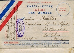 Briefkarte im Querformat Vorderseite: "République française / Carte-Lettre / expediée / des Armées", unten: "Note Officielle. / Cette correspondance sera transmise immédiatement à la condition expresse de ne mentionner ni origine, ni localité, ni mouvement passé ou futur des troupes, mais seulement des nouvelles personnelles de l’expéditeur ou d’autres militaires du même corps." [Offizielle Notiz / Diese Korrespondenz wird sofort übermittelt werden, unter der ausdrücklichen Bedingung, nicht den Ursprung, den Ort oder vergangene oder zukünftige Truppenbewegungen zu erwähnen, sondern nur persönliche Neuigkeiten des Absenders oder anderen Soldaten des gleichen Korps.], links oben befindet sich ein blau, weiß, rotes Band in Anlehnung an die Trikolore, Absender: "En campagne / onsieur Feuillet / au 365e de ligne / 20e compagnie, par Verdun (Meuse)", Adressat: "Monsieur Feuillet / Sergent au 165e de ligne / 5e compagnie / par Verdun (Meuse) / en campagne"; Rückseite: handschriftlicher Text Transkription: "jeudi le 11 2 15 Cher frère Je te fait deux mots pour de donner ma nouvelle adresse et te faire savoir que je suis en bonne santé espérant qu’il en est de même pour toi, je suis arriver à Verdun mardi dans la journé, j’ai fait la demande pour aller ensemble il n’a pas moyen, c’est bien regrettable, enfin que veux tu il faut bien obeir, espérant que tout va bien d’un coté comme de l’autre, j’ecris à mon frère aussi. j’espère que tu a reçu mes cartes de (...), tu me donnera des nouvelles le plutot possible en me disant si ton mandat est retrouvé, je ne vois plus rien à te dire pour aujourd’hui. D’autre que je t’embrasse de coeur bon frère pour la vie Feuillet Henri Demain soir je part au avant poste." Übersetzung: "Donnerstag, der 11. 2. 15 Lieber Bruder Ich schreibe dir zwei Worte, um dir meine neue Adresse zu geben und dich wissen zu lassen, dass ich bei guter Gesundheit bin, in der Hoffnung, dass es bei dir ebenso ist. Ich bin Dienstag tagsüber in Verdun angekommen, ich habe eine Anfrage gestellt, um zusammen zu gehen, es war nicht möglich, das ist sehr bedauernswert, schließlich muss man gehorchen, wenn du etwas willst. In der Hoffnung, dass alles gut läuft auf der einen und auf der anderen Seite, schreibe ich auch meinem Bruder. Ich hoffe, du hast meine Karten erhalten, du wirst mir deine Neuigkeiten so früh wie möglich berichten und mir sagen, ob dein Mandat wieder gefunden wurde, ich sehe für heute nichts mehr zu erzählen. Außer, dass ich dich von Herzen umarme, lieber Bruder für’s Leben Feuillet Henri Morgen Abend gehe ich zum vorherigen Posten."