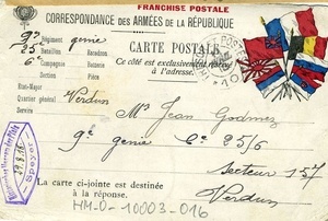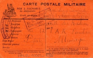 Karte im Querformat. Auf der Vorderseite: "Carte postale militaire", unten: "(a) Indications à fournir par le destinataire dès son / arrivée au corps./ (1) Ne porter l’indication d’adresse que si le desti- / nataire appartient à une unité sédentaire. / (2) Dans le cas contraire, inscrire vis-à-vis le mot par: / le nom de la localité où est stationné le dépôt du corps" [(a) Angaben vom Empfänger nach seiner Ankunft im Korps zu liefern. / (1) Adressangaben nur eintragen, wenn der Empfänger einer sesshaften Einheit angehört. / (2) Im gegenteiligen Fall tragen Sie gegenüber dem Wort par ein: den Namen des Ortes, wo das Depot des Korps stationiert ist], Adressat: "Service des prisonniers de guerre / Feuillet Paul / Sergent / (Im) Lazarett des Kasern des 12 EAR Landau / Pfalz Allemagne". Auf der Rückseite ein handschriftlicher Text. Transkription: "Preures, ce 5 Avril 1915 Mon cher frère. Je t’envoie ces deux mots pour te dire que tout le monde est toujours en bonne santé, et j’espère que tu es toujours en bonne santé et que tes blessures vont bien. Ta soeur qui t’aime A. (B)ellier.". Übersetzung: "Preures, diesen 5. April 1915 Mein lieber Bruder. Ich sende dir diese zwei Worte, um dir zu sagen, dass alle bei guter Gesundheit sind und ich hoffe, dass du noch bei guter Gesundheit bist und deine Verwundungen in Ordnung sind. Deine Schwester, die dich liebt A. (B)ellier.".