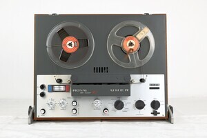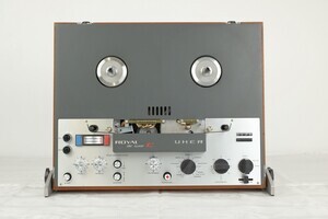 "Royal de Luxe" ist das Spitzenmodell der Fa. Uher. Die Bandmaschine kann liegend, stehend oder auch an der Wand hängend betrieben werden. Das Gerät verfügt über vier Bandgeschwindigkeiten,( 2,5/4.7/9,5/ 19cm/sec) und es können Spulengröße bis 18 cm Durchmesser abgespielt werden. Erstmals konnte die komplette Einheit der Tonköpfe von 2 auf 4 Spur, über eine Steckverbindung, ausgetauscht werden. Unser Gerät ist eine 2 Spur Ausführung und hat in der Typenbezeichnung ein (C) was darauf hindeutet, dass keine Endstufe eingebaut ist. Als Besonderheit ist die Steuerungsmöglichkeit von Dia Projektoren zu nennen und die Hinterbandkontrolle. Sie ermögliche die direkte Kontrolle der Aufnahme. Neben den Standard Bedienelementen sind an der Vorderseite noch 2 getrennte Micro Eingänge für Stereo Aufnahmen, samt Aussteuerungsanzeige, eingebaut. Auf der Rückseite sind Anschlüsse für Stereo Kopfhörer, Projektor Steuerung, Ein/Ausgang für Verstärker bzw. Radio und Plattenspieler. Ein rauchfarbener Plexiglasdeckel schützt das Gerät.