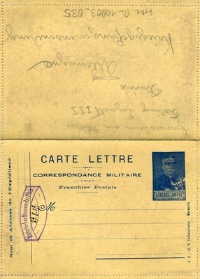 Briefkarte im Querformat. Auf der Vorderseite: unbeschrifteter Adressvordruck, "Carte Lettre / Correspondance militaire / Franchise Postale", seitlich: "A.C, 19. R. Châteauredon - Marseille", Abbildung: Portrait von Général Joffre. Auf der Rückseite: "Germersheim am Rhein Festungs Lazarett III Bavière Allemagne Kriegsgefangenensendung". Die Innenseite enthält Skizzen.