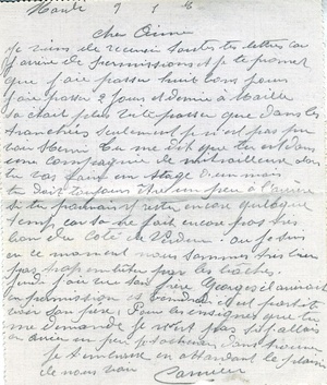 Gefaltetes Kärtchen im Querformat. Auf der Vorderseite: "C.M. [Correspondance Militaire ?]", Absender: "C. Ch(...) 232e Infanterie 2e Compagnie M.R. Secteur 44", Adressat: "Monsieur Aimi Larquetoux / caporal / 151e Infanterie 1e Compagnie de Mitrailleuse / 4 section / Secteur 35"; Stempel: "Tresor et Postes 94". Auf der Rückseite ein handschriftlicher Text. Transkription: "Mardi 9 1 16 Cher (Aimi) je vien de recevoir toutes tes lettres car j’arrive de permissions A je te promet que j’ai passe huit bons jours j’ai passe 2 jours et demie à (Maillé) sa était plus vite passe que dans les tranchées seulement je n’a pas pu voir (Henri). Tu me dit que tu es dans une compagnie de mitrailleuse alors tu vas faire un stage d’un mois. Tu doit toujours être un peu à l’(...) si tu pouvais y rester encore quelque temp car sa ne fait encore pas très bon du coté de Verdun, ou je suis en ce moment nous sommes très bien. Pas trop embêté par les bôches. Lundi j’ai vu ton frère Georges il arrivait en permission et Vendredi il est parti de voir son frère, Tom les insignes que tu me demande je n’en ai pas si j’allais au (...) un peu je t’(...) dont trouver. Je t’embrasse en attandant le plaisir de nous voir. Camien" Übersetzung: "Dienstag 9. 1. 16 Lieber (Aimi) ich habe gerade alle deine Briefe erhalten, da ich aus dem Fronturlaub gekommen bin. Ich verspreche dir, ich habe acht gute Tage verbracht, zweieinhalb Tage habe ich in (Maillé) verbracht, sie sind viel schneller vergangen als in den Gräben, ich habe nur (Henri) sehen können. Du sagst mir, dass du in einer Maschinengewehrkompanie bist, also wirst du eine Ausbildung für einen Monat machen. Du musst immer ein bisschen (...) sein, ob du dort noch eine gewisse Zeit länger bleiben kannst, denn es ist noch nicht besonders gut auf der Seite von Verdun, wo ich im Moment bin, geht es uns gut. Nicht zu sehr geärgert von den Deutschen. Am Montag habe ich deinen Bruder Georges gesehen, er kam aus dem Fronturlaub und am Freitag ist er gegangen, um seinen Bruder zu treffen, Tom, die Abzeichen, nach denen du mich gefragt hast, ich habe keine, wenn ich ein bisschen nach (...) komme, (...) ich dir, welche zu finden. Ich umarme dich in der Erwartung der Freude, uns zu sehen. Camien".