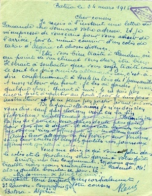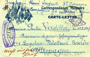 Briefkarte im Querformat. Auf der Vorderseite: "Correspondance Militaire / Carte-Lettre", Abbildung: acht Fahnen, die mit einem Band zusammengehalten werden, Absender: "Fougbali René Sergent 3e Zouares Compagnie Gh-Batna-Algerie", mit roter Tinte: "nicht (...)", Adressat: "Monsieur Paulin Verdillon du 258e d’Infanterie / Prisonnier de guerre Gefangenenlager No. 1 Landau Palatinat Bavière Allemagne", Stempel 1: "Batna Constantin", Stempel 2+3: "Geprüft". Auf der Rückseite: handschriftlicher Text: Transkription: "Batna le 24 mars 1916 Cher cousin Je recois à l’instant une lettre de Fernande me donnant votre adresse. Et je m’empresse de vous écrire pour vous aviser de l’arrivée, pour le même courrier, d’un colis de tabac d’algérie et choses diverses. Etes vous bien traité à Landau où au point de vue climat vous devez être bien. Il serait à souhaiter que vous soyez traité comme le sont les pris (...) allemands ici, c’est-à-dire conformément à touts les lois de l’humanité. A mon retour du front, je les ais gardés j’en sais quelque chose! Quant à moi, je ne suis pas encore prêt à partir au front car je suis passé instructeur et je ne pense pas partir avant (...). De la guerre elle (...) je n’en dois rien vous dire, sauf que chacun (...) eu la fin victorieuse relativement prochaine. Patientez-vous, la fin de l’armée sera sans doute plus gaie pour vous que le début. Et dans cette opinion nous ne voyons rien d’offensant pour les allemands. Ainsi leur attaque de fin février sur Verdun, sans leur contester bien de qualités nos journeaux affirment qu’elle à échoué. Vous me disez ce qui vous aura plu dans le colis et le prochain sera garni à votre goût. Ecrivez-moi très longuement. Espérons que bientôt nous nous rencontrerons à (Cadeut). OU! alors quelle bonbon ce jour-là. Madamme se joint à moi. Bien cordialement votre cousin René" Übersetzung: "Batna, den 24. März 1916 Lieber Cousin Ich erhalte gerade einen Brief von Fernande, die mir Ihre Adresse gibt. Und ich beeile mich, Ihnen zu schreiben, um Ihnen für die selbe Briefsendung die Ankunft eines Päckchens mit algerischem Tabac und verschiedenen Dingen anzukündigen. Werden Sie in Landau gut behandelt, wo es Ihnen vom Sichtpunkt des Klimas aus gut ergehen müsste. Es wäre zu wünschen, dass Sie wie die deutschen Gefangenen hier behandelt werden, das heißt nach den Gesetzen der Menschlichkeit. Bei meiner Rückkunft zur Front habe ich diese bewacht, ich weiß darüber etwas! Was mich betrifft, bin ich noch nicht bereit, an die Front zu gehen, weil ich am Ausbilder vorbei bin und nicht denke vor (...) zu gehen. Über den Krieg muss ich Ihnen nichts sagen außer, dass jeder (...) das Ende des Krieges würde demnächst kommen. Seien Sie geduldig, das Ende der Armee wird für sie ohne Zweifel fröhlicher sein als der Anfang. Und mit dieser Meinung sehen wir nicht Beleidigendes für die Deutschen. Sowie ihr Angriff auf Verdun Ende Februar, ohne ihre Qualitäten anzufechten, versichern unsere Zeitschriften, er [der Angriff] sei gescheitert. Sie sagen mir, was Ihnen in den Paketen gefallen hat und das nächste wird nach Ihrem Geschmack gefüllt sein. Schreiben Sie mir sehr lange. Hoffen wir, dass wir uns bald in (Cadeut) treffen. OH! Ja, welches Bonbon dieser Tag. Madame schließt sich mir an. Sehr herzlich Ihr Cousin René".
