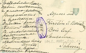 Karte im Querformat. Auf der Vorderseite: Gemälde eines Astes von einem Rosenstrauch mit zwei dunkelroten Blüten, darüber steht mit schwarzer Tinte geschrieben "Xpeumoer Bockpece!". Auf der Rückseite: Adressat: "Fürstin Barialinsky / Bois Cerf Lausanne / Schweiz", Serie/Herausgeber: "Serie A No. 2 Made in Switzerland; Paul Bender, Zürich".