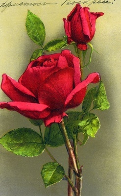 Karte im Querformat. Auf der Vorderseite: Gemälde eines Astes von einem Rosenstrauch mit zwei dunkelroten Blüten, darüber steht mit schwarzer Tinte geschrieben "Xpeumoer Bockpece!". Auf der Rückseite: Adressat: "Fürstin Barialinsky / Bois Cerf Lausanne / Schweiz", Serie/Herausgeber: "Serie A No. 2 Made in Switzerland; Paul Bender, Zürich".