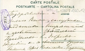 Karte im Querformat. Auf der Vorderseite: Gemälde eines Straußes aus bunten Blumen auf dunkelgrünem Hintergrund. Auf der Rückseite: Adressat: "Fürstin Barialinsky / Bois Cerf Lausanne".