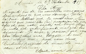 Karte im Querformat. Auf der Vorderseite: "Carte Postale. [durchgestrichen und per Handschrift verbessert in "C.M."] - Postkaart. / Union postale universelle. - Wereldpostvereeniging. / Belgique. - Belgie. / (Côté réservé à l’adresse. - Zijde voor het adres alleen.)", unten: "(*) Cette inscription peut être biffée. - Dat ovschrift mag doorgehaaid worden.", links: Adressvordruck, rechts oben: Abbildung eines Portraits eines Mannes, darunter steht: "Ne pas livrer dimanche / Net bestellen op zondag", Absender: "Mademoiselle S. Maroua / 8 Place au fil à Amiens / Somme", Adressat: "Monsieur Rat Octave / Soldat au 120e d’Infanterie / 4e Compagnie / Secteur 110", mit Buntstift: "recu le 8 Octobre", Stempel: "Amiens / 8 16 / 28 - 9 / 15 / Somme". Auf der Rückseite ein handschriftlicher Text. Transkription: "Amiens, le 27 Septembre 1915 Cher Ami. N’ayant pas de vos nouvelles nous nous demandons ce que vous devenez. Voilà la 9e lettre que je vous écris. Nous espérons que vous êtes en possesion de votre colis et que votre santé est bonne. Nous la notre est satisfaisante malgré les tourments. J’aime à penser que vous êtes toujours avec Eugène l’exil sera moins dur pour vous deux. Cordiales poignées de main de ma soeur et de moi. Votre amie (Jasmande)". Übersetzung: "Amiens, den 27. September 1915 Lieber Freund Da wir keine Neuigkeiten von Ihnen erhalten haben, fragen wir uns, wie es Ihnen geht. Dies ist der 9. Brief, den ich Ihnen schreibe. Wir hoffen, dass Sie im Besitz ihres Gepäcks sind und dass Sie gesund sind. Unsere Gesundheit ist zufriedenstellend trotz der Plagerei. Ich denke gern, dass Sie noch immer mit Eugène sind, das Exil wäre weniger hart für Sie beide. Herzlicher Händedruck von meiner Schwester und mir. Ihre Freundin (Jasmande)".