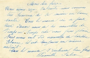 Karte im Querformat. Auf der Vorderseite: "Correspondance des Armées / de la République / Carte en franchise", Adressvordruck, Abbildung: 4 Landesfahnen, Adressat: "Monsieur Eugène Loyen / 18e Bataillon de chasseurs / a pied / 11e Compagnie rue de la Republique / 53 / Fontenay le comte / Vendée". Auf der Rückseite ein handschriftlicher Text. Transkription: "Mon cher frère Nous avons recu ta carte nous sommes très heureux de te savoir en bonne santée. Tous le monde ici se porte bien donne nous de tes nouvelles de temps en temps cela nous fera plaisir. Nous avons eut des nouvelles de tonton Etienne il est toujours au même endroit. Tous le monde t’embrasse bien fort. Famille (Salve)". Übersetzung: "Mein lieber Bruder Wir haben deine Karte erhalten und sind sehr glücklich, dich bei guter Gesundheit zu wissen. Hier geht es allen gut, sende uns von Zeit zu Zeit Neuigkeiten von dir, das würde uns freuen. Wir haben Neues von Onkel Etienne erhalten, er ist immernoch am selben Ort. Alle umarmen dich fest. Familie (Salve)".