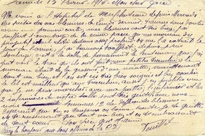 Karte im Querformat. Auf der Vorderseite: "Correspondance / des Armées / de la République / Carte Postale / en franchise", Adressvordruck, Absender: "Feuillet W. Sergent / Hopital temporaire No. 7 / Neufchateau "Vosges"", Adressat: "Monsieur Feuillet Paul Sergent / 165e Régiment d’Infanterie / 5e Compagnie / Verdun", Stempel 1: "Neufchateau Vosges", Stempel 2: "Hôpital temporaire No. 7 Neufchateau", Abbildung: 3 Landesfahnen. Auf der Rückseite ein handschriftlicher Text. Transkription: "Samedi 13 Fevrier 1915 Mon cher frère Me voici à l’Hopital de Neufchateau depuis Mercredi des suites de mes blessures, de Lundi dernier, t’auras sans doute recue ma première carte, mes blessures vont très bien, j’ai souffert d’avantage de la cuisse parce qu’un morceau du projectif etait resté dedans assez profond. On me l’a extrait le jour de l’arrivé. J’ai beaucoup souffert depuis. Je suis soulagé: c’est à la salle de pansement le lendemain que j’ai put voir le trou qu’ils ont fait: "une petite tranche" le nouveau était de la grosseur d’une noisette; maintenant tout va bien, et l’on est ici très bien soignés et bien couchés le lit est meilleur qu’aux tranchées, aussi j’en profités une que je ne peux marcher, avec ma patte; l’infirmier et les 2 infirmières de notre salle sont très gentils avec nous. Nous sommes 12 de differentes blessures. Espérant que tu es toujours en bonne santé je te quitte en te rassurant que tout va bien et en t’embrassant de tout coeur. Ton frère qui t’aime. Bien le bonjour aux tous officiers de la Compagnie. Feuillet". Übersetzung: "Mein lieber Bruder Ich bin im Krankenhaus in Neufchateau seit Mittwoch durch die Folgen von meinen Verwundungen von letztem Montag, du wirst sicherlich meine erste Karte erhalten haben, meinen Verwundungen geht es gut, ich habe besonders durch meinen Oberschenkel gelitten, weil ein Teil des Projektils recht tief darin geblieben war. Man hat es mir am Ankunftstag herausgeholt. Seitdem habe ich sehr gelitten. Ich bin erleichtert: im Verbandssaal konnte ich zum ersten Mal das Loch sehen, das sie gemacht hatten. "Ein kleiner Schnitt", der neue hatte die Größe einer Nuss; jetzt geht alles gut, man wird hier sehr gut gepflegt und kann gut schlafen. Das Bett ist besser als in den Gräben. Ich profitiere auch davon, dass ich nicht laufen kann mit meiner Haxe; der Pfleger und die 2 Pflegerinnen von unserem Saal sind sehr freundlich zu uns. Wir sind 12 mit unterschiedlichen Verwundungen. In der Hoffnung, dass du noch gesund bist, schließe ich dir versichernd, dass alles gut läuft und dich von ganzem Herzen umarmend. Dein Bruder, der dich liebt. Viele Grüße an die Offiziere der Compagnie. Feuillet".