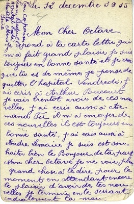 Karte im Querformat. Auf der Vorderseite: "Correspondance Militaire / Carte postale en Franchise / Pour que cette carte soit recue de suite ne mettre que des nouvelles personnelles." [Damit diese Karte empfangen wird, nur persönliche Neuigkeiten schreiben.], unbeschrifteter Adressvordruck. Auf der Rückseite ein handschriftlicher Text. Transkription: "Le 12 decembre 1915 Mon cher Octave Je repond à ta carte lettre qui m’a fait grand plaisir. Je suis toujours en bonne santé et je crois que tu es de même je pense de quitter l’hopital Vendredi. J’ai ecris à Arthur Bucourt je vais bientot avoir de ces nouvelles. J’ai ecris aussi à Armand Ter il m’a envoyer de ces nouvelles il est toujours en bonne santé. J’ai ecris aussi à Andre Lemaire je suis est souhaiter bien le Bonjour de ta part. Mon cher Octave je ne voie plus grand chose à te dire pour le moment en attendant encore le plaisir d’avoir de tes nouvelles je termine en te serrant cordialement la main. Ton copain Leon Beduill Hopital Ecole Modèle Mens (Isire)". Übersetzung: "Den 12. Dezember 1915 Mein lieber Octave Ich antworte auf deine Briefkarte, die mir große Freude bereitet hat. Ich bin immernoch gesund und ich glaube, dass es dir ebenso geht. Ich denke, dass ich das Krankenhaus am Freitag verlasse. Ich habe Arthur Bucourt geschrieben, ich werde bald Neuigkeiten haben. Ich habe auch an Armand Ter geschrieben, er hat mir seine Neuigkeiten gesendet, er ist noch gesund. Ich habe auch an Andre Lemaire geschrieben und habe ihm Grüße von dir ausgerichtet. Mein lieber (Octave), für den Moment weiß ich nichts mehr großartig zu erzählen. In der Erwartung der erneuten Freude, deine Neuigkeiten zu bekommen, schließe ich dir herzlich die Hand schüttelnd. Dein Freund Leon Beduill".