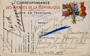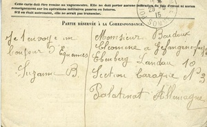 Karte im Querformat. Auf der Vorderseite: "Correspondance / des Armées de la République / Carte en franchise", Adressat: "Monsieur Boudoux (Gleomene) à Gefangenenlager Ebenberg Landau 10 Section baraque N. 3 Palatinat Allemagne", handschriftlich: "foix (somme) / non admis / retour foix", Abbildung: sechs Landesfahnen, die mit einem Band zusammengehalten werden, darunter steht klein "Stern Graveur", Stempel 1: "Prüfungsstelle des II. Armee-Korps Ludwigshafen a. Rh.", Stempel 2: "Poix (...) Somme". Auf der Rückseite ein handschriftlicher Text. Transkription: "Je t’envoye un bonjour d’(Equemes) Suzanne B. [gleiche Adresse wie auf der Vorderseite]". Übersetzung: "Ich sende dir einen Gruß aus (Equemes)".