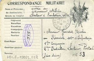 Karte im Querformat. Auf der Vorderseite: "Correspondance des Armées / de la République / Carte en franchise", Absender: "Millière André 24e Section / C.D.A", Adressat: "Monsieur Jeandet Nicolas au 10e d’Infanterie 5e Compagnie 2e Bataillon / Secteur postal 53", Abbildung: sechs Landesfahnen, auf denen die Namen "France, Angleterre, Serbie, Belgique, Monteneoro, Russie" [Frankreich, England, Serbien, Belgien, Montenegro, Russland] stehen, in der Mitte von diesen sind Waffen abgebildet und umrahmt werden sie von goldfarbenen Zweigen. Auf der Rückseite: handschriftlicher Text, Abbildung: "Revanche". Transkription: "Cher beau frère Je viens de recevoir votre carte qui ma bien fait plaisir d’apprendre que vous êtes en bonne santé pour moi la santé et de même. Je viens de recevoir des nouvelles de (Sombernon). Toute la famille se porte bien et surtout la petite Lucienne. Enfin je ne vois plus rien à vous dire pour le moment. Dans l’attente recevez cher beau frère une cordial poignée de main. Millière". Übersetzung: "Lieber Schwager Gerade habe ich eure Karte erhalten, die mir große Freude bereitet hat, da ich las, dass ihr bei guter Gesundheit seid, bei mir ist die Gesundheit ebenso. Ich habe deine Neuigkeiten aus (Sombernon) erhalten. Der ganzen Familie geht es gut und besonders der kleinen Lucienne. Für den Moment sehe ich nichts mehr, um es euch zu erzählen. In der Erwartung erhalte, lieber Schwager, einen herzlichen Händedruck. Millière".