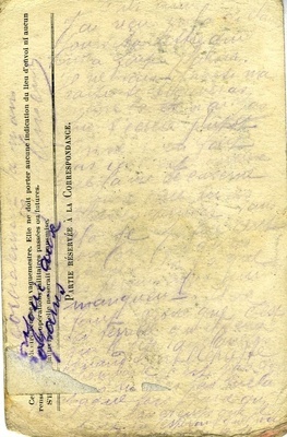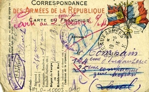 Karte im Querformat. Auf der Vorderseite: "Correspondance / des Armées de la République / Carte en franchise", Absender: "Parti au 2e (Louon) le (...), L. Al(...) 254e Régiment 17e Compagnie / secteur 103", Adressat: "Monsieur Compain / 124e d’Infanterie / 24e compague 3e section / Varal", Abbildung: sechs Landesfahnen, die mit einem Band zusammengehalten werden, darunter steht klein "Stern Graveur", Stempel: "Poste aux Armées / * / 19 - 6 / 15 / K". Auf der Rückseite ein handschriftlicher Text [schlecht lesbar]. Transkription "Bonjour aux copains (...)". Übersetzung "Hallo an die Freunde (...)".