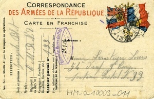 Karte im Querformat. Auf der Vorderseite: "Correspondance / des Armées de la République / Carte en Franchise", Abbildung: sechs Landesfahnen, die mit einem Band zusammengehalten werden, darunter steht klein "Stern Graveur", Adressat: "Monsieur (Semiteyer) Louis / 54e d’Infanterie 3e Compagnie / secteur postal N.33", Absender: "Joseph (Blot) / C.M.R.N.2 / Secteur postal 133", seitlich: "Impr. Nat. - Modèle A1 pour les troupes en opérations". Auf der Rückseite: Hinweis, dass diese Karte nur ausgetragen wird, wenn sie ausschließlich persönliche Informationen enthält und ein handschriftlicher Text. Transkription: "Monsieur (Semiteyer) Je t’envoi deux mots afin de te dire que je ne suis plus aux tranchées je suis conducteur de mitrailleuses je me plait beaucoup mieux dans ce metier que d’être dans ces trous j’ai écrit à ta femme (...) je lui ai donné de mes nouvelles je suis toujours en bonne santé et j’espère que ma carte te trouvera de même en attendant le plaisir de la fin de cette gerre je te serre la main de tout coeur. Ton (...) J. Blot" Übersetzung: "Herr (Semiteyer) Ich sende dir zwei Worte, um dir zu sagen, dass ich nicht mehr im Graben bin, ich bin Maschinengewehrführer, in diesem Beruf gefällt es mir besser als in diesen Löchern, ich habe deiner Frau geschrieben und ihr Neuigkeiten mitgeteilt, ich bin noch bei guter Gesundheit und ich hoffe, dass meine Karte dich ebenso vorfindet, in der Erwartung der Freude des Endes dieses Krieges drücke ich dir die Hand von ganzem Herzen. Dein (...) J. Blot"
