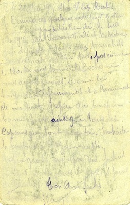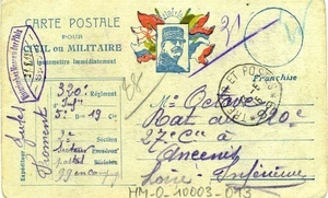 Karte im Querformat. Auf der Vorderseite: "Carte postale / pour / Civil ou Militaire / à transmettre immédiatement", Abbildung: sechs Landesfahnen, die um das Bild eines Soldaten [vermutlich Joseph Joffre] herum gesteckt sind, darüber steht "1915", Absender: "Jules / Sioment / 320e Régiment / d’Infanterie / 5e Bataillon 19e Compagnie / 2e Section / Secteur postal 99 en compagne", Adressat: "Monsieur Octave / Rat au 120e / 27e Compagnie à Ancenis / Loire-Inférieure", Stempel: "Tresor et Postes 99 / 23 - 5 / 15", handschriftlich: "28", "31". Auf der Rückseite ein handschriftlicher Text [unleserlich].