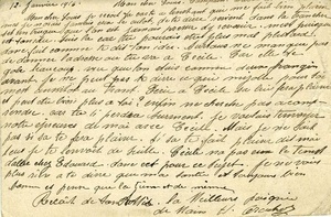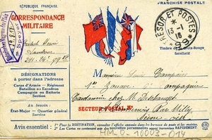 Karte im Querformat. Auf der Vorderseite: "République francaise / Correspondance / Militaire", Abbildung: sieben Landesfahnen, Absender: "Brachat Henri / Vambaur / 291. 24e 99e", Adressat: Monsieur Louis Compain / 1e (...) 6e Compagnie / (...) chez Monsieur Deschampt / A Da(...) par Milly / Seine-oise", Stempel: "Tresor et Postes 99 / 13 - 1 / 16". Auf der Rückseite ein handschriftlicher Text: Transkription: "Mon cher Louis je recoit ta carte à l’instant qui me fait bien plaisir mes je n’avais jamais eux le culot, de te dire revient dans la trancher set un truque que l’on est jamais presser d’y revenir. M’est puisque cet ton idu, suis la car tu pouvais etre plus mal plutard. donc fait comme te dit ton idu. surtous ne manque pas de donner l’adresse ou tu va a cecile. Car elle te gobe beaucoup. vu que l’on etais comme deux frangin avant. Je ne peus pas te dire ce qui (...) pour toi m’est aussitot au front. Ecris a Cecile sa lui fera plaisir et peut etre bien plus a toi? enfin ne cherche pas à comprendre, car tu li perdra surment. Je voulais temoyer notre épreuves de mai avec Cecile. Mais je ne sait pas si sa te fera plaisir, si sa te fait plaisir dit mai leur je te l’envoit de suitte. Cecile n’a pas eux le temps d’aller chez Edouard, donc cet pour ce sujet. Je ne vois plus rien à te dire que ma santé et toujours bien bonne et pense que la tienne et de même. Recoit de ton (...) la meilleure (...) de main (...)". Übersetzung: "Mein lieber Louis, ich erhalte gerade deine Karte, die mir viel Freude bereitet, aber ich hatte niemals den Mut, dir zu sagen, geh zurück in den Graben, das ist falsch, dass man niemals gezwungen ist, zurückzugehen. Aber wenn es dein (Wille) ist, (...) es könnte dir später schlechter gehen. Also mach es so wie dein (Wille) es sagt. Besonders, versäume nicht, deine Adresse mitzuteilen oder du gehst zu Cecile. Denn sie (mag dich sehr). Sieh, wir waren zuvor wie zwei Brüder. Ich kann dir nicht sagen, was (...) für dich, aber bald an der Front. Schreib Cecile, das wird ihr Freude machen und dir vielleicht noch mehr? Also versuche nicht, es zu verstehen, denn du wirst sicher verlieren. Ich will dir unsere Fotos vom Mai mit Cecile (zeigen). Aber ich weiß nicht, ob es dir Freude bereitet, wenn es dich freuen würde, sag mir Bescheid, ich schicke sie dir sofort. Cecile hatte keine Zeit zu Edouard zu gehen, daher. Ich sehe nichts mehr, dir zu erzählen, außer dass meine Gesundheit noch gut ist und ich denke, deine ebenso. Erhalte von deinem (...) den besten Hände(druck)".