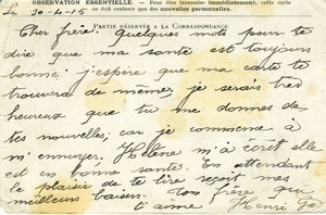Karte im Querformat. Auf der Vorderseite: "Franchise Postale / Correspondance des Armées de la République / Carte postale / Ce côté est exclusivement reservé à l’adresse.", Abbildung: sieben Landesfahnen, links oben im Eck ein kleines Abzeichen mit den Buchstaben EPC, Adressat: "Monsieur Jean Godmez / 9e genie Compagnie 25/6 / secteur 157 / Verdun", Stempel: "Tresor et Postes 10 / 11 Avril 15". Auf der Rückseite ein handschriftlicher Text. Transkription: "Cher frère Quelques mots pour te dire que ma santé est toujours bonne. J’espère que ma carte te trouvera de même, je serais très heureux que tu me donnes de tes nouvelles; car je commence a m’ennuyer. Heléne m’a ecrit elle est en bonne santé. En attendant le plaisir de te lire recoit mes meilleurs baisers. Ton frère qui t’aime Henri Godmez". Übersetzung: "Lieber Bruder Einige Worte, um dir zu sagen, dass meine Gesundheit immernoch gut ist. Ich hoffe, dass meine Karte dich ebenso auffinden wird, ich wäre sehr glücklich, wenn du mir deine Neuigkeiten mitteilst, weil ich anfange, mich zu langweilen. Heléne hat mir geschrieben, sie ist gesund. In Erwartung der Freude von dir zu lesen erhalte meine besten Küsse. Dein Bruder, der dich liebt Henri Godmez".