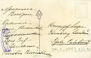 Karte im Querformat. Auf der Vorderseite: Gemälde eines Rosenstraußes mit zwei rosanen und einer roten Blüte. Auf der Rückseite: Adressat: Kriegsgefangenenlager Ebenberg Landau Pfalz Palatinat.