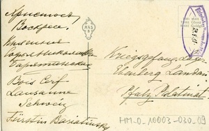 Karte im Querformat. Auf der Vorderseite: Gemälde eines Rosenstraußes mit zwei roten Knospen, zwei halb geöffneten gelben und einer rosafarbenen Blüte und Kleeblättern. Auf der Rückseite: Adressat: Kriegsgefangenenlager Ebenberg Landau Pfalz Palatina.