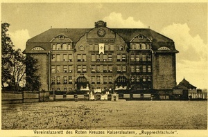 Karte im Querformat. Auf der Vorderseite: Gemälde eines Rosenstraußes aus drei roten Knospen, einer roten Blüte und Kleeblättern. Auf der Rückseite: Adressat: Kriegsgefangenenlager Ebenberg Landau Pfalz Palatinat.