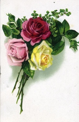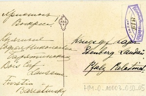 Karte im Querformat. Auf der Vorderseite: Gemälde eines Rosenstraußes mit jeweils einer roten, rosafarbenen und gelben blühenden Rose. Auf der Rückseite: Adressat: Kriegsgefangenenlager Ebenberg Landau Pfalz Palatinat