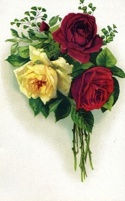 Karte im Querformat. Auf der Vorderseite: Gemälde eines Rosenstraußes mit zwei blühenden roten Rosen, einer blühenden gelben Rose und einer roten Knospe. Auf der Rückseite: Adressat: Kriegsgefangenenlager Ebenberg Landau Pfalz Palatinat.