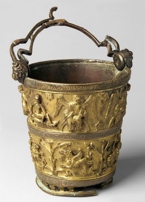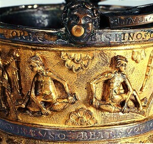 Weihwasserkessel Um 1116–1119 Bronzeguss, Reliefstreifen kupfergetrieben und punziert, Inschriften Einlegearbeit in Silber; Henkel beschädigt H. 16,5 cm Speyer, Dom- und Diözesanmuseum im Historischen Museum der Pfalz, D 83 Der Weihwasserkessel stammt aus dem ehemaligen Benediktinerkloster St. Alban in Mainz, von wo er nach der Zerstörung des Klosters im 16. Jahrhundert in den Mainzer Dom gelangte. 1792 kam der Kessel im Zuge der Revolutionskriege nach Aschaffenburg und wurde 1825 vom bayerischen König Ludwig I. dem Speyerer Dom geschenkt. Drei umlaufende Inschriftbänder gliedern das aufwendig mit Reliefs verzierte Gefäß in zwei Zonen. Im oberen Fries wechseln sich Darstellungen der vier Evangelisten mit Personifikationen der vier Paradiesflüsse ab. Die Evangelisten sind als geflügelte Wesen menschlicher Gestalt mit den Köpfen ihrer jeweiligen Symbole wiedergegeben; in der Linken das Buch haltend, die Rechte zum Redegestus erhoben. Ihnen zugeordnet sind die vier Paradiesflüsse Phison, Geon, Tigris und Euphrat, dargestellt als nackte Jünglinge, die ein Gefäß halten, dem Wasser entströmt. Die Inschrift auf dem oberen Rand des Kessels verdeutlicht den typologischen Bezug zwischen den vier Paradiesflüssen und den Evangelisten: BIS BINOS QVADRV(m) COMPLENTES DOGMATE MVNDV(m) DESIGNANT TOTIDE(m) DIFFVSA FLVENTA P(er) ORBE(m): „Die (vier) Evangelisten, die die vierfache Welt mit ihrer Lehre erfüllen, werden sinnbildlich bezeichnet durch ebenso viele Flüsse, die sich durch die Welt ergießen.“ Der mittlere Inschriftstreifen nennt den Stifter des wertvollen Gefäßes: HOC ALBANE DEO QVI VIVIS SANGVINE FVSO ABBATIS VOTV(m) BERTHOLDI SVSCIPE TECVM: „Diese Weihegabe des Abtes Berthold nimm gnädig auf, Alban, der du für Gott lebst durch dein vergossenes Blut“. Auf dem unteren Streifen setzt sich die Inschrift fort: HVIC INFINITE DEPOSCENS GAVDIA VITE: „Indem du für ihn die Wonnen des ewigen Lebens erbittest“. Auf dem Henkel findet sich schließlich der Hinweis auf den Künstler, der das Werk geschaffen hat: HAERTWI(CH ERAT FACTOR) ET SNELLO MEI FVIT AVCTO(r): „Hartwich war der Verfertiger und Snello mein Urheber“. Snello war Kustos der Kirche St. Alban in Mainz. Vielleicht war er derjenige, der den Entwurf für den Kessel geschaffen hat, und Hartwich der ausführende Kunsthandwerker, der den Kessel in Bronze goss und die Reliefs anfertigte. Der untere Fries zeigt eine Jagdszene. In einem Wald aus stilisierten Bäumen verfolgen zwei mit Lanzen bewaffnete Reiter Löwen, einen Greif und eine Sphinx. Deutlich ist die Anlehnung an antike Vorbilder zu spüren. Jagddarstellungen waren als zentrales Thema höfischen Lebens auch im Mittelalter beliebt. (Sabine Kaufmann)
