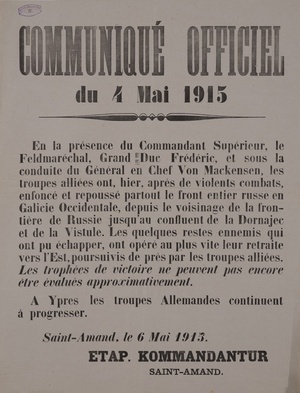 Wandanschlag in französischer Sprache. Herausgegeben im von Deutschland besetzten Frankreich, Saint-Amand, 31. Mai 1915. Kriegssituation am 30. Mai 1915. "Situation de la Guerre au 30 Mai 1915. A Ypres et à Arras, Français et Anglais ont renouvelé leurs attaques avec des forces considérables, mais ils ont été repoussés encore une fois avec de grosses pertes. A l’Est, les Russes ont fait en vain des contre-attaques désespérées. Aux Dardanelles, à cause des nombreuses pertes de vaisseaux subies durant les derniers jours, Français et Anglais ont retiré leurs vaisseaux de guerre de l’entrée du détroit et les ont mis en sécurité dans une baie afin d’éviter de plus grands dommages. Les Italiens font de vains efforts pour franchir la frontière Autrichienne. Un bataillon a été anéanti. La ville de Venise a de nouveau été bombardée. Saint-Amand, le 31 Mai 1915. Mob. Etap.-Komm. Saint-Amand."