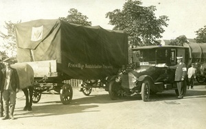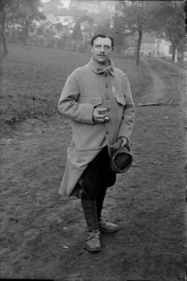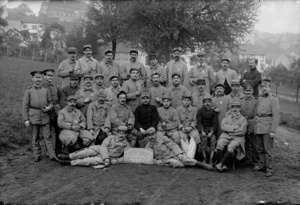 Die Schwarzweiß-Aufnahme zeigt eine Gruppe von fünf französischen Kriegsgefangenen des Ersten Weltkriegs im Lager von Pirmasens in der Pfalz. Originaltitel: "5 Französische Soldaten (Kriegsgefangene) in Pirmasens"; Gruppenporträt, entstanden wohl 1915.