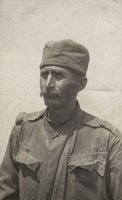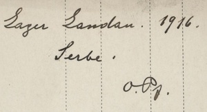 Schwarz/weiß Aufnahme Einzelporträt Rückseite: "Lager Landau 1916. Serbe. (...)"
