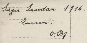 Schwarz/weiß Aufnahme Gruppenporträt Rückseite: "Lager Landau 1916. Zuaren. (...)"
