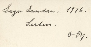 Schwarz/weiß Aufnahme Gruppenporträt Rückseite: "Lager Landau. 1916. Serben. (...)"
