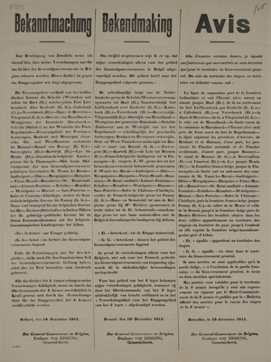Wandanschlag in deutscher, französischer und niederländischer Sprache. Herausgegeben im von Deutschland besetzten Belgien, Brüssel, 26. November 1914. Anordnungen für die von deutschen Truppen besetzten belgischen Gebiete. Gezeichnet durch den General-Gouverneur in Belgien, Generalfeldmarschall Freiherr von der Goltz.