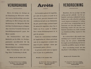 Wandanschlag in deutscher, französischer und niederländischer Sprache. Herausgegeben im von Deutschland besetzten Belgien, Brüssel, 10. November 1914. „Verordnung Der Laut aller zivil-straf und prozess-rechtlichen Fristen ebenso der Laut der Verjährung ist, soweit diese Fristen und Verjährung gegen Deutsche, Oesterreicher, Ottomanen und Angehöriger neutraler Staaten in den okkupierten Landesteilen Belgiens laufen oder geltend gemacht werden können, für die Zeit vom 1. August 1914 bis 15. November 1914 gehemmt. Diese Verordnung tritt am Tage ihrer Verkündung in Kraft. Brüssel, den 10. November 1914. Der General-Gouverneur in Belgien, Freiherr von der Goltz, Generalfeldmarschall.“