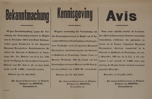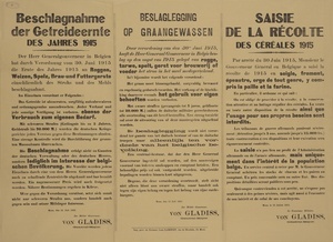 Wandanschlag in deutscher, französischer und niederländischer Sprache. Herausgegeben im von Deutschland besetzten Belgien, Brüssel, 2. September 1914. „Proklamation. Seine Majestät der Deutsche Kaiser haben geruht, mich nach okkupierung [sic] belgischen Gebiets zum Generalgouverneur in Belgien zu ernennen. Ich habe des Sitz des Generalgouvernements in Brüssel (Ministerium für Wissenschaft und Künste, rue de la Loi) aufgeschlagen. Auf Grund weiterer Anordnung Seiner Majestaet ist dem Generalgouverneur eine Zivilverwaltung angegliedert (Kriegsministerium, rue de Louvain) anderen Spitze Seine Exzellenz Herr von Sandt steht. Die deutschen Heere dringen siegreich in Frankreich vor. Hier im belgischen Gebiete Ruhe und Ordnung aufrecht zu erhalten, ist Aufgabe der Generalgouvernements. Jede feindselige Handlung der Einwohnerschaft gegen Angehörige der [sic] deutschen Heeres, jeder Versuch, ihren Verkehr mit der Heimat zu stoeren, Eisenbahnen, Telegraphen, Fernsprechverbindungen zu gefaehrden oder gar zu unterbrechen, wird unnachsichtlich geahndet werden. Aufruhr oder Widerstand gegen die deutsche Verwaltung haben ruecksichtslose Niederwerfung zu gewaertigen. Die harte Notwendigkeit des Krieges bringt es mit sich, dass bei Bestrafung feindseliger Handlungen Unschuldige mit den Schuldigen leiden. Umsomehr is [sic] es Pflicht aller vertaendig denkenden Bewohner Belgiens, die unruhigen Elemente im Lande von jeder Ausschreitung gegen die oeffentliche Ordnung abzuhalten. Kein belgischer Buerger, der friedfertig seinem Erwebe [sic] nachgeht, hat irgend etwas von seiten der deutschen Truppen und Behoerden zu befuerchten. Soweit irgend moeglich, sollen Handel und Wandel wieder aufgenommen, die industriellen Betriebe wieder in Gang gebracht und die Einbringung der Ernte vollendet werden. Belgier! Von Niemand wird verleugnung [sic] seiner vaterlaendischen Gesinnung verlangt, wohl aber eine vernuenftige Fuegsamkeit und unbedingter Gehorsam gegen die Anordnungen des Generalgouvernements. Von Eurem Verhalten, von dem Vertrauen und dem Masse der Unterstuetzung, die das Volk, insbesondere die im Lande verbliebenen Staats- und Gemeindebeambten [sic], dem Generalgouvernement entgegen bringen, wird es abhaengen ob die neue Verwaltung Euch und Eurem Lande zum Segen gereicht. Gegeben, Bruessel, den 2. September 1914. Der Kaiserliche General-Gouverneur in Belgien, Freiherr von der Goltz, Generalfeldmarschall.“