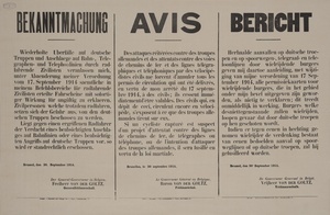 Wandanschlag in deutscher, französischer und niederländischer Sprache. Herausgegeben im von Deutschland besetzten Belgien, Brüssel, 4. November 1914. „Bekanntmachung Die Bevölkerung Belgiens wird darauf aufmerksam gemacht, dass der verkauf und die Verbreitung von Zeitungen und sonstigen, durch den Druck oder auf irgend eine andere Weise vervielfältigten Nachrichten, die nicht ausdrücklich von der deutschen Zensurbehörde zugelassen sind, streng verboten ist. Ubertretungen [sic] ziehen sofortige Verhaftung und längere Freiheitsstrafe nach zich [sic]. Brüssel, den 4. November 1914. Der General-Gouverneur in Belgien, Freiherr von der Goltz, Generalfeldmarschall.“
