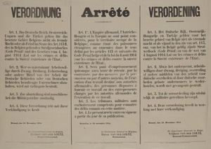 Wandanschlag in deutscher, französischer und niederländischer Sprache. Herausgegeben im von Deutschland besetzten Belgien, Brüssel, 28. November 1914. „Verordnung I. Die Vorschriften der Verordnung vom 3. November 1914 betreffend Zahlungsverbot gegen England und Frankreich (veröffentlich im Gesetz- und Verordnungsblatt für die okkupierten Gebiete Belgiens, N° 10) werden im Wege der Vergeltung auch auf Russland und Finnland für anwendbar erklärt. II. Den Erlass von Vollzugs-Vorschriften zwecks Sicherung der Durchführung dieser Verordnung und der Verordnung vom 3. November 1914 übertrage ich hiermit dem Generalkommissar für die Banken in Belgien. III. Diese Verordnung tritt sofort in Kraft. Brüssel, den 28. November 1914. Der General-Gouverneur in Belgien, Freiherr von der Goltz, Generalfeldmarschall.“