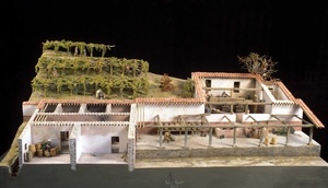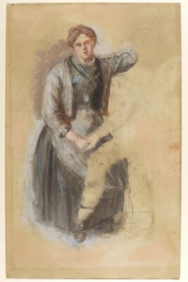 Darstellung einer Burgruine vor einem dunklen Waldgebiet auf der rechten Seite des Gemäldes. Der Blick der Betrachter*innen wird längs einer Flußlandschaft nach links in den Bildraum und in Richtung eines Kegelbergs in der Ferne geführt. Die räumliche Illusion wird durch Luft- und Lichtperspektive unterstützt.