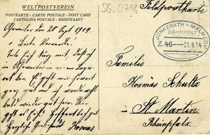 Karte im Querformat. Auf der Vorderseite: Schwarz/weiß Aufnahme der Burgruine in der Nähe der Apollinarisquelle. Auf der Rückseite: aufgedruckt: "Weltpostverein / Postkarte - Carte Postale - Post Card / Cartolina Postale - Briefkaart", Stempel: "Jünkerath - Malmedy / Bahnpost / Z.46 - - 21.9.14" sowie handschriftlicher Text. Transkription: "Ahrweiler den 20. Sept. 1914 / Liebe Verwandte! / Teile Euch kurz mit, daß ich in Ahrweiler in einem Lazaret bin. Es geht mir soweit ganz gut und ich werde wohl bald wieder gut sein. Wie geht es Euch? Hoffentlich gut / Herzliche Grüße sendet (Kosmas)". Im Historischen Museum der Pfalz war vom 29.4.2014 bis 24.9.2017 die Ausstellung "1914 - 1918. Die Pfalz im Ersten Weltkrieg" zu sehen. Auf einen öffentlichen Aufruf hin meldeten sich zahlreiche Privatpersonen, ihre Objekte wurden in dieser Sammlung erfasst und z. T. auch in der Ausstellung gezeigt. Die Objekte befinden sich im Eigentum der Privatpersonen und sind nicht Teil der Sammlungen des Historischen Museums der Pfalz.