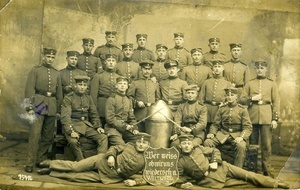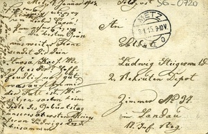 Karte im Querformat. Auf der Vorderseite: Schwarz/weiß Gruppenportrait von Soldaten, die um eine Granate herum aufgebaut sind. Vor ihnen steht ein Schild, auf dem geschrieben steht: "Wer weiss ob wir uns wiedersehn. Weltkrieg 1914". Auf der Rückseite: Adressat: "Soldat / Ludwig Steigerwald / 2. Rekruten Depot / Zimmer Nr. 37 / in Landau / 18. Inf. Reg.", Stempel: "Metz / 8.1.15 9-10V." sowie handschriftlicher Text. Transkription: "Feldpost / Metz, 7. Januar 1915 (...) die besten Grüse / aus weiter Ferne / sendet dir dein (...) Karl. Wie / geht es dir? Hoff - / endlich noch gut, was auch bei mir / der Fall ist. Wir / sitzen soeben beim Feste des Geburstag unseres (...)ersten Kriegs (...) Ludwigs (...) beisammen (...) viele Grüße auf baldiges Wiedersehen (...)". Im Historischen Museum der Pfalz war vom 29.4.2014 bis 24.9.2017 die Ausstellung "1914 - 1918. Die Pfalz im Ersten Weltkrieg" zu sehen. Auf einen öffentlichen Aufruf hin meldeten sich zahlreiche Privatpersonen, ihre Objekte wurden in dieser Sammlung erfasst und z. T. auch in der Ausstellung gezeigt. Die Objekte befinden sich im Eigentum der Privatpersonen und sind nicht Teil der Sammlungen des Historischen Museums der Pfalz.